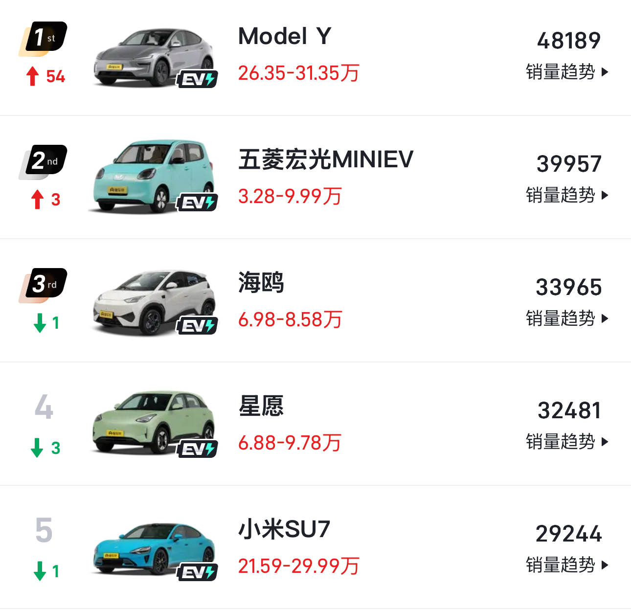 宋PLUS新能源在2024年4月以31809輛的銷量超越Model Y(26356輛),成為SUV銷冠,其高性價比和成熟的混動技術對中端市場形成碾壓。