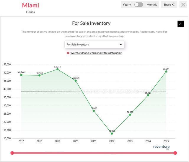 Reventure銷售數據表明,當前邁阿密房屋銷售量比疫情高峯下降了50%,比3月份的長期平均水平低30%,邁阿密庫存已飆升至5.1萬套房屋,創下有記錄以來3月份的第二高水平。