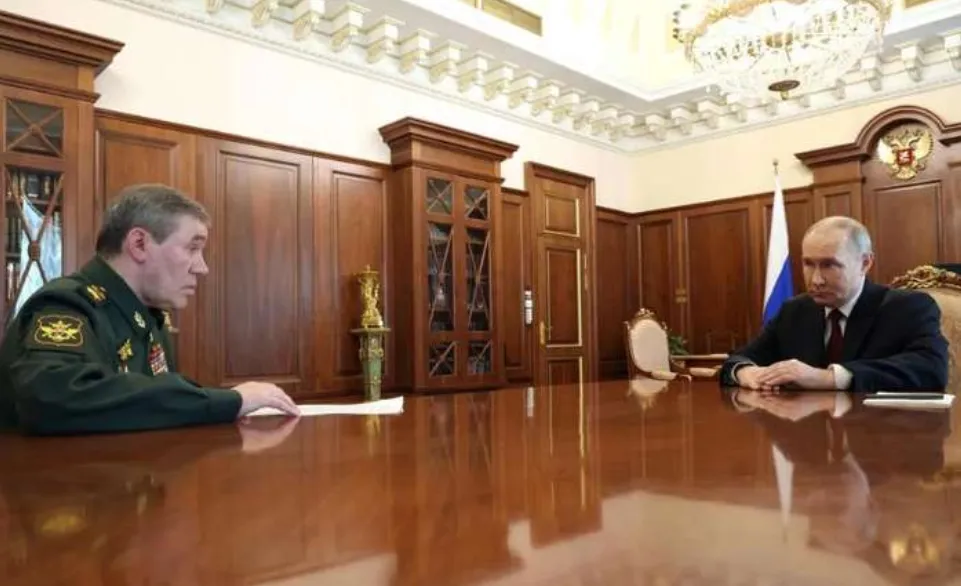 4月19日,俄羅斯武裝力量總參謀長格拉西莫夫在克里姆林宮向俄羅斯總統普京彙報戰況。(圖源:路透)