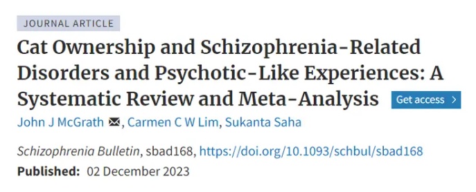 2023年12月,澳大利亞昆士蘭精神健康研究中心的幾位研究員在《精神分裂症通報》(Schizophrenia Bulletin)上發表了一篇論文稱,“養貓的人患精神疾病的概率比不養貓的人高2倍以上。”