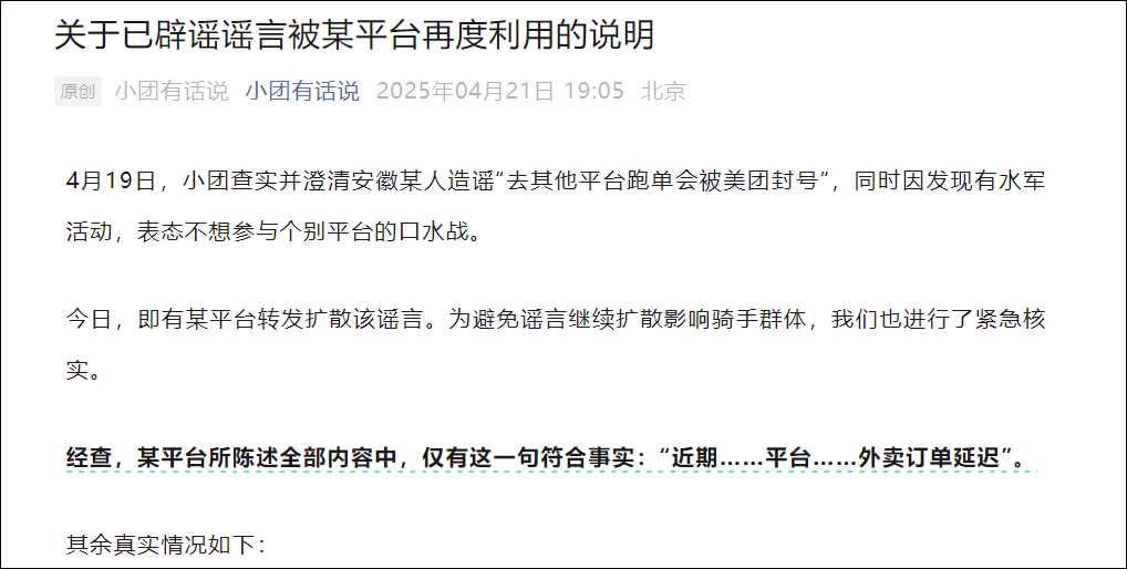 4月21日晚上,美團回懟,發佈《關於已闢謠謠言被某平台再度利用的説明》,文中稱,4月19日,有人造謠“去其他平台跑單會被美團封號”,今日,某平台轉發擴散該謠言。暗指京東傳謠。