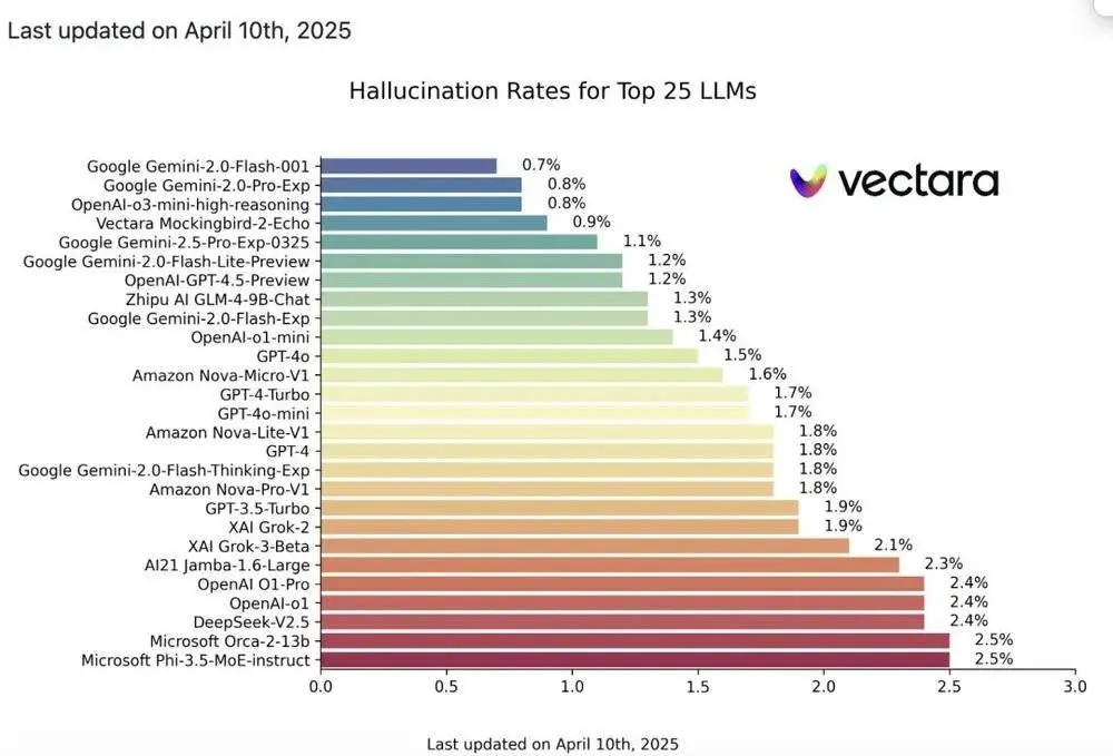 聲譽良好的Vectara在2025年3月對目前市場上主流的AI大模型測試發現,大部分主流大模型產品的幻覺率大都處於一個較低的水平, Gemini-2.0-Flash-001,以0.7%的低幻覺率位居榜首,顯示出其在處理文檔時幾乎沒有引入虛假信息。此外,Gemini-2.0-Pro-Exp 和 OpenAI 的 o3-mini-high-reasoning 模型分別以0.8%的幻覺率緊隨其後。
