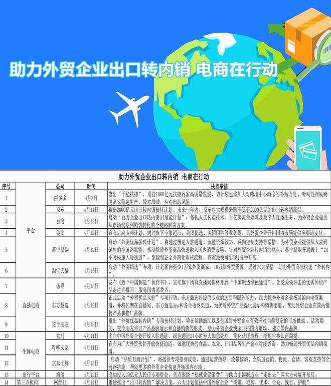中美關税戰升級,為應對關税調整影響,拼多多、淘寶天貓、京東、百度、美團、得物、夢餉科技、值得買、蘇寧易購等平台,抖音電商、謙尋、東方甄選、交個朋友、辛選等直播電商,盒馬、叮咚買菜、本來生活等生鮮電商、以及滴滴等出行平台,紛紛啓動出口轉內銷扶持計劃,助力優質外貿企業開拓國內市場。