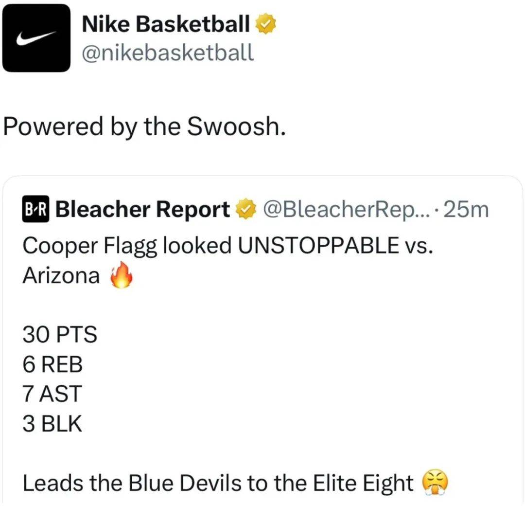 當球員在場上打出亮眼表現,其簽約品牌應該為其應援造勢。但在New Balance還沒發出任何物料的時候,耐克率先在社媒上轉發了弗拉格的驚豔賽場表現,並配文:「Powered by the Swoosh. 」