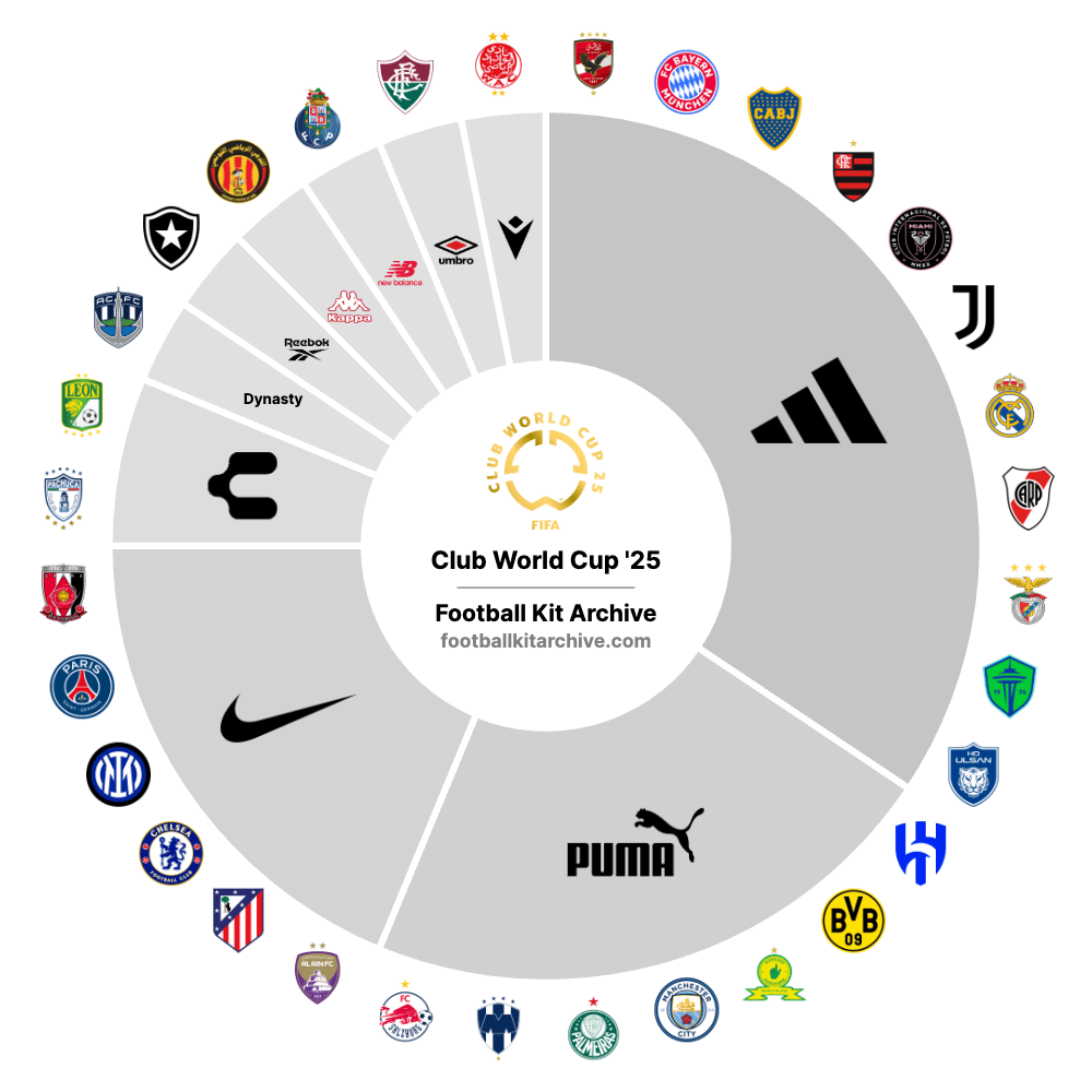 據統計,已經確認的31支世俱杯參賽球隊,PUMA獨佔7席,是擁有球隊第二多的球衣贊助商,旗下曼城、帕爾梅拉斯等球隊都是分屬歐洲和南美的頂級強隊。