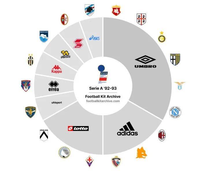 意甲1992/93賽季,各球隊的運動品牌贊助情況 圖源:Football Kit Archive