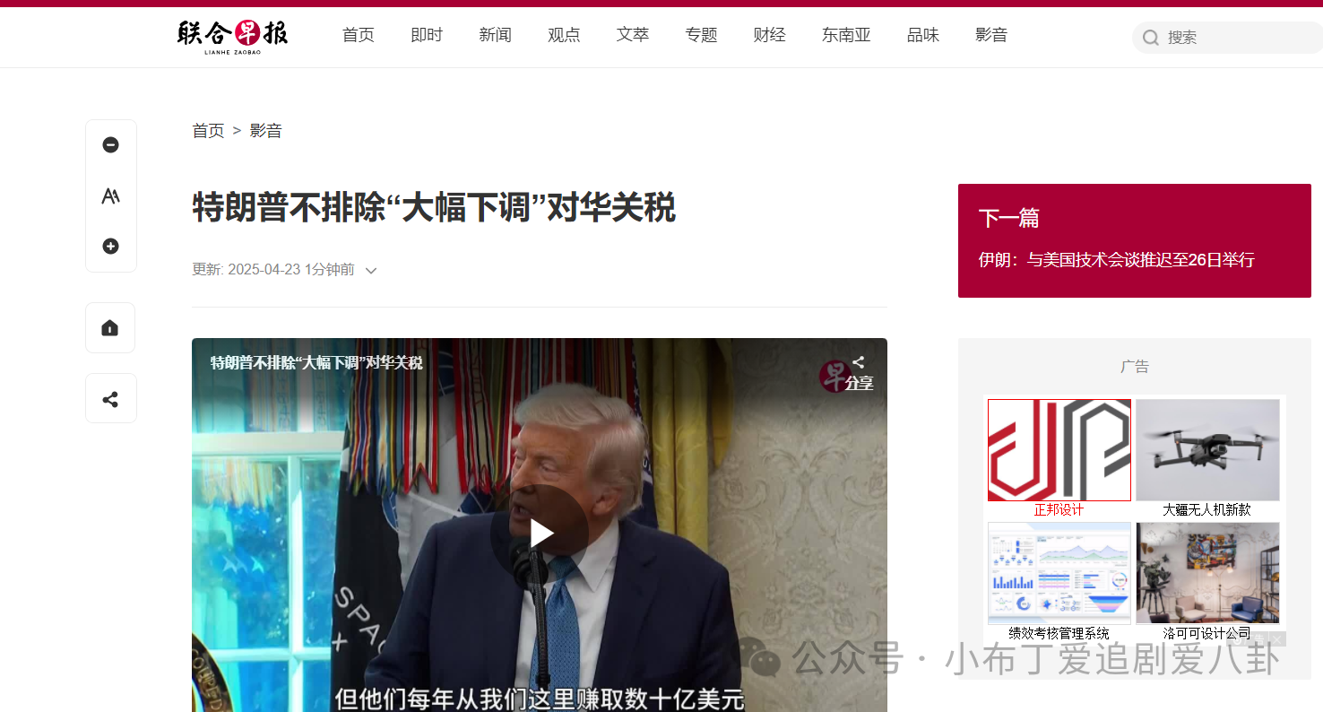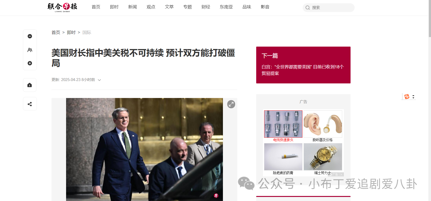 也承認美國對中國的最終關税不會像他達到的145%水平,如果非要這麼搞的話,估計中國和美國就沒得談了。