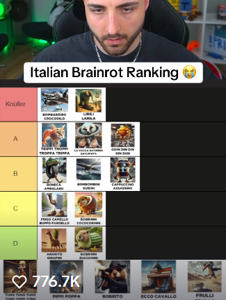 其規律就是將某生物和某物體餵給AI,讓它生成一個隨機拼接出來的東西,再給這東西取一個押韻的意大利語名字,最後由意大利男聲AI讀出來,並且聽起來一定要像舌頭打結了,魔性十足。
