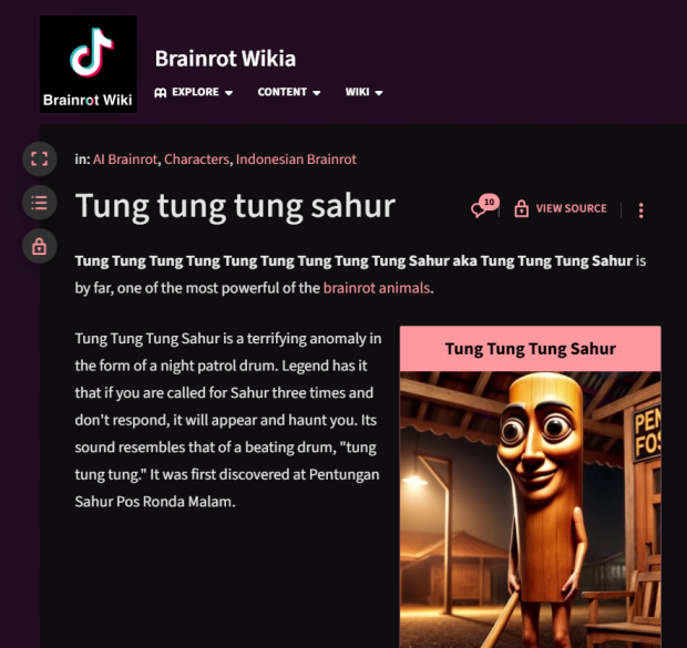 上述視頻裏的奇怪生物其實是一種現在國外盛行的“腦腐(Brain Rot)文化”,是指社交媒體上的低質量信息過度輸入而導致受眾的精神和智力衰退。中譯中就是腦殘視頻看多了人變成SB。
