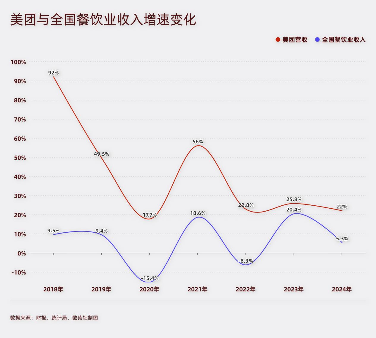 與之相比,國家統計局數據顯示,全國餐飲收入55718億元,增長5.3%;限額以上單位餐飲收入15298億元,增長3.0%。增速遠低於美團平台的營收增速。
