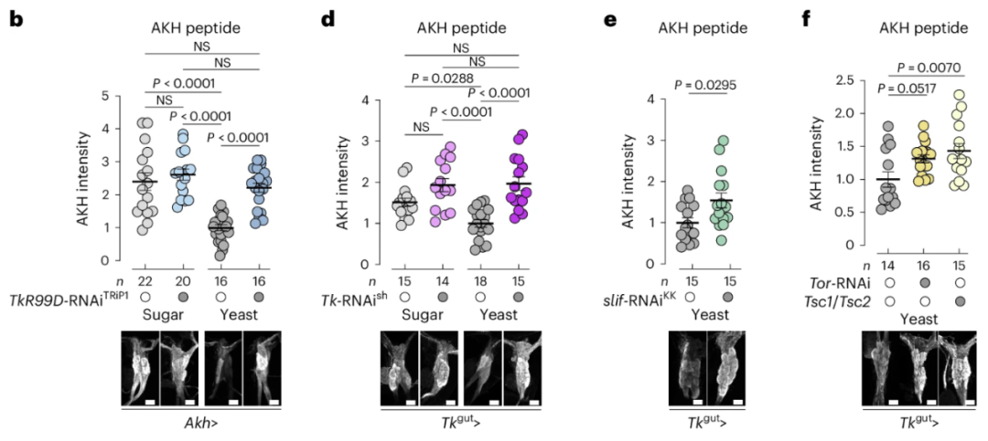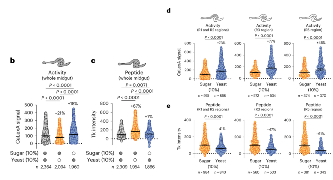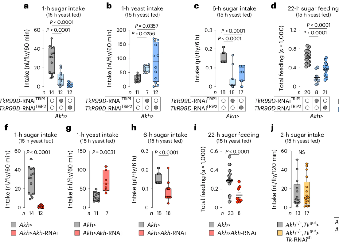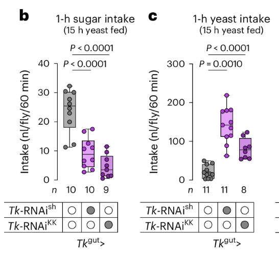 於是,研究者干擾了果蠅EECs產生Tk的過程,結果,即使果蠅已經吃了很多酵母,卻依然胃口大開,而對糖水則興趣平平。也就是説,Tk就是腸道感知蛋白質後,發出的“口味改變”信號!