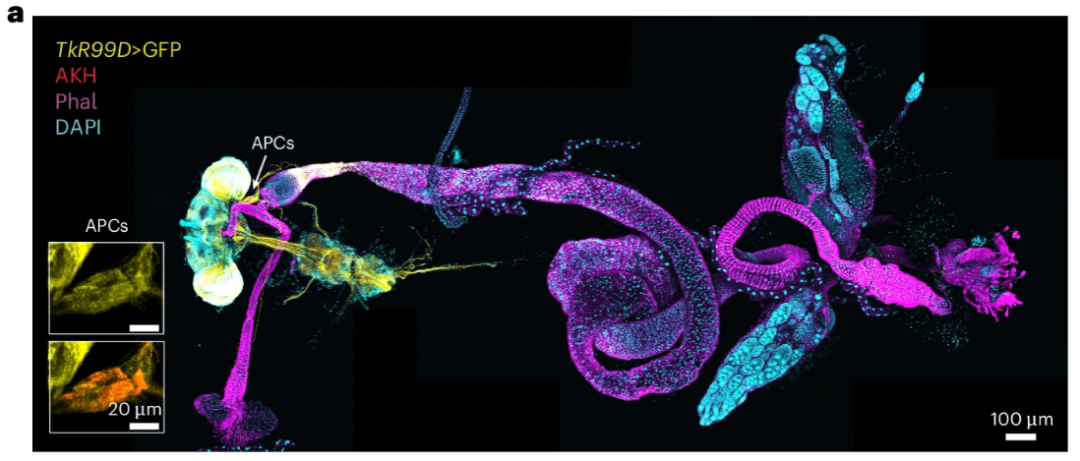 研究發現,Tk並不直接作用於大腦,而是扮演了“信使”角色:它會作用於大腦中負責產生AKH的神經內分泌細胞(APCs)表面上的Tk的受體——TkR99D。