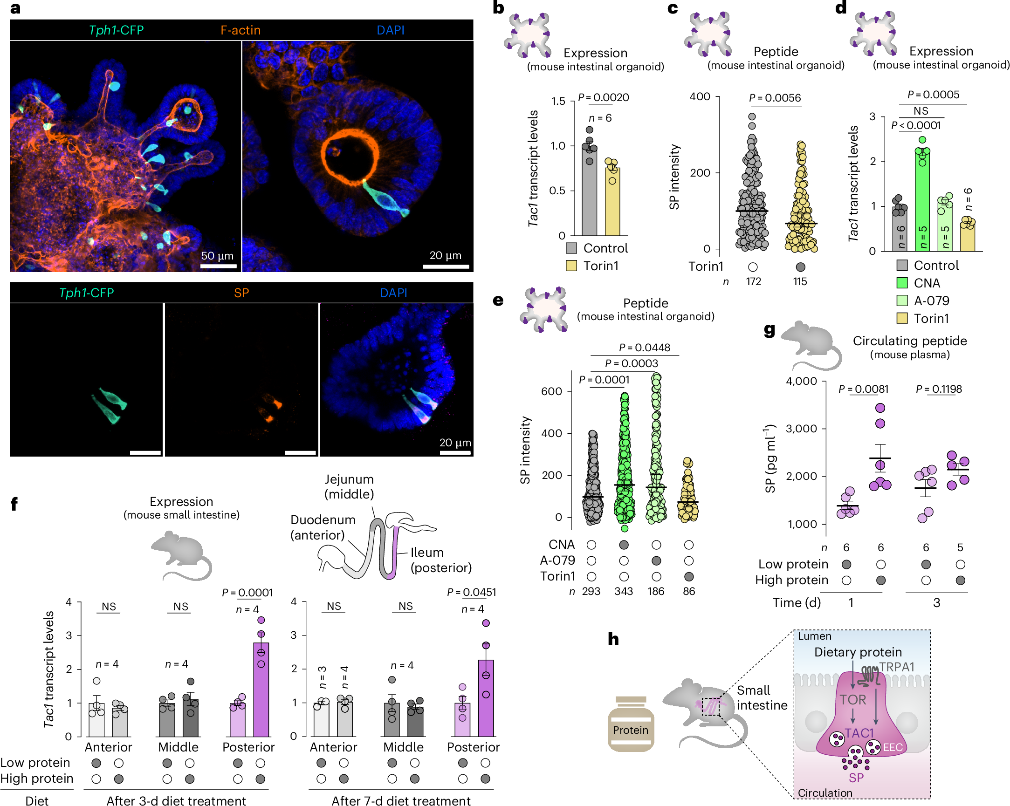 在體外培養的小鼠腸道類器官中,抑制TOR或TRPA1通路,也同樣會影響Tac1的表達和P物質的釋放。也就是説,這條通路在包括人類在內的哺乳動物中也可能存在!