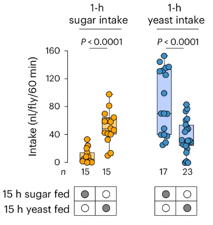 圖注:果蠅攝入酵母或糖後的食慾變化