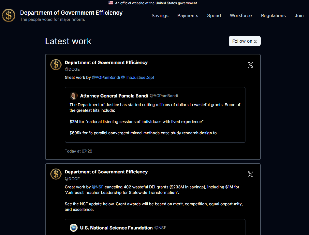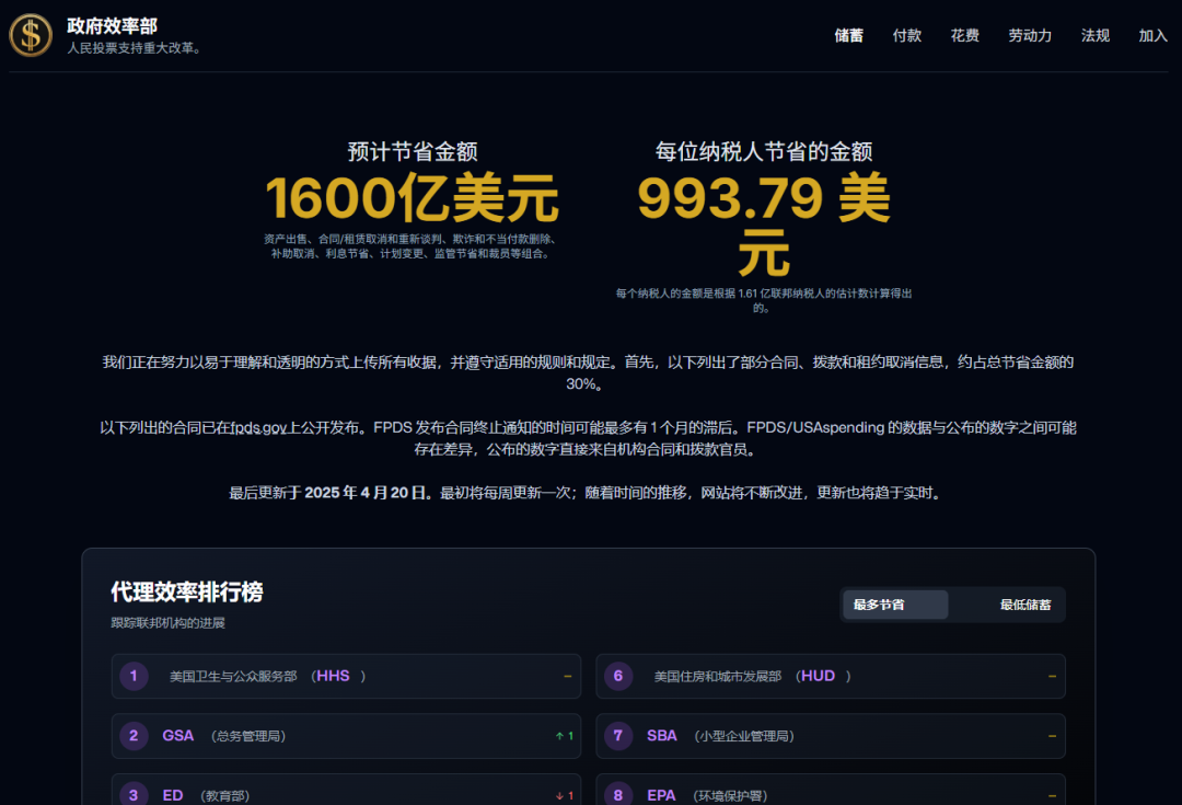 政府效率部所有的工作都會在官網公開,界面跟推特近似,排版清晰。他們還設了具體的排行榜,哪個部門積極改進,哪個在摸魚一目瞭然。