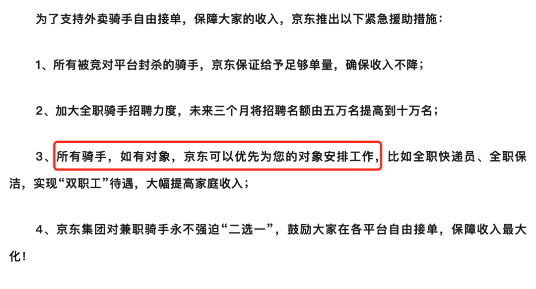 為了保障騎手權益,京東更是一連推出四大援助措施,其中為優先騎手對象安排工作這條,堪稱員工關懷教科書般的操作。