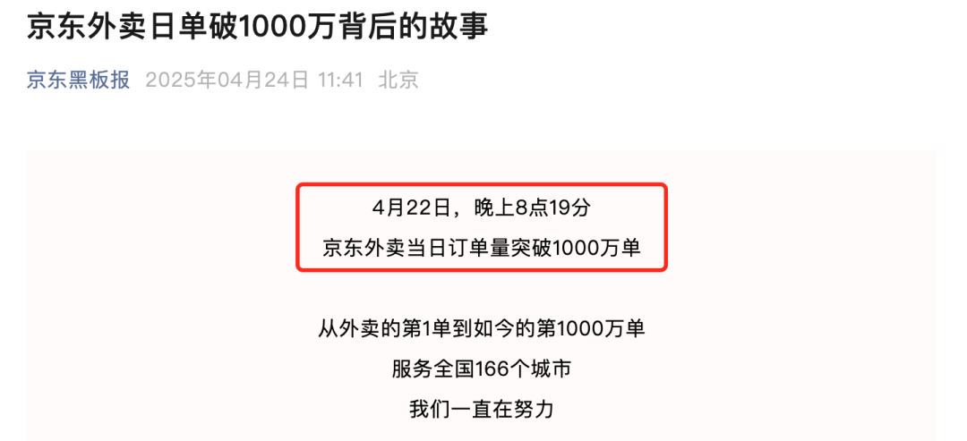 事實上,市場的反應也説明了這一點,從2月11日平台正式上線送出第一單以後,京東外賣幾乎是以爆炸式的增長在發展,3月24日日訂單量突破100萬、4月15日日訂單量突破500萬、4月22日日訂單量突破1000萬……
