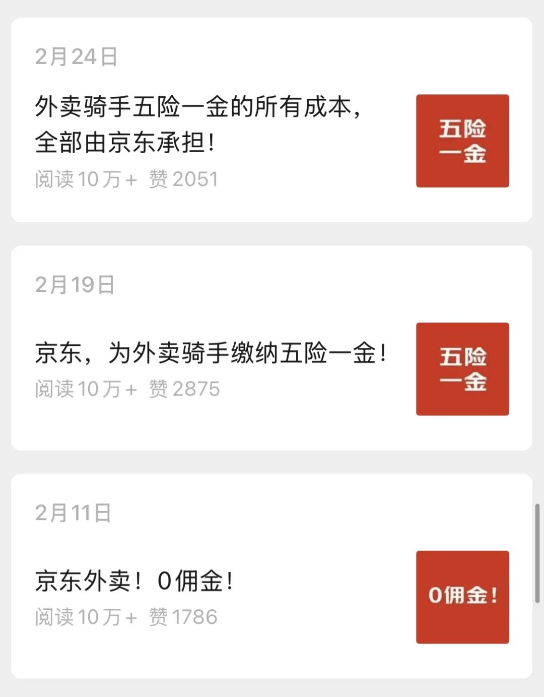 自從2月11日上線以來,京東外賣便先後拋出了**商家全年免佣金、為外賣全職騎手繳納五險一金、用户百億餐補一連串補貼狠活,**當所有人都以為這又是一場中國互聯網行業典型的燒錢大戰時,京東卻突然掀了牌桌,不演了。