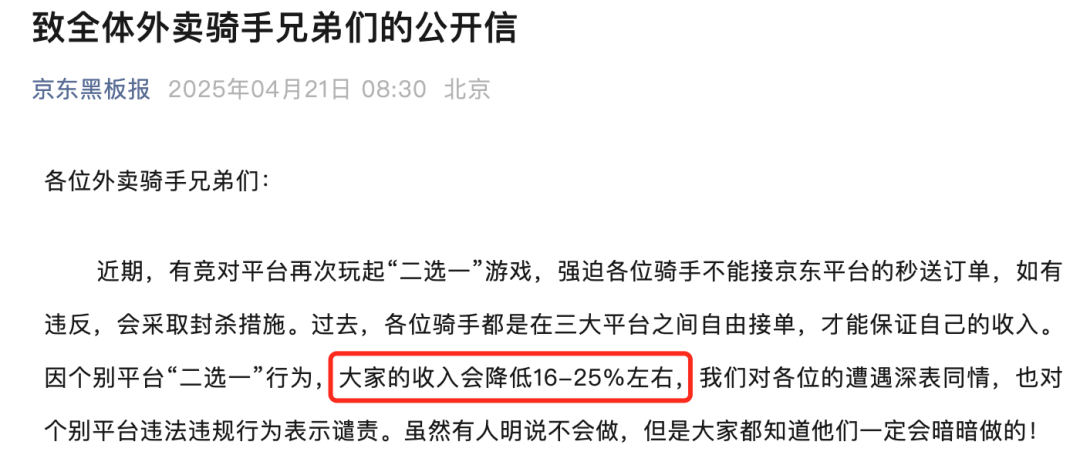 在公開信裏,京東表示有競對平台玩起“二選一”遊戲,強迫騎手不能接京東平台的秒送訂單,如有違反會採取封殺措施,而按照京東給出的數據參考,受到“二選一”限制,騎手的收入會降低16%到25%左右。