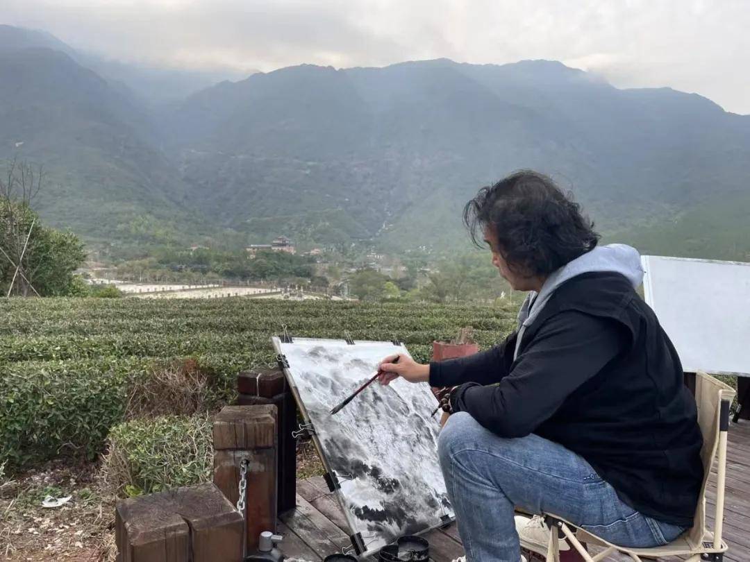 周波的寫生不同於他人對景描摹:他必先深入當地,觸摸人文、挖掘特色,創作時去粗取精、融入主觀藝術加工,筆下“大景大觀”往往賦予實景更動人的神采。在探訪蓮花山時,周波曾花大量時間駐足仙人洞瀑布下觀水勢,夜宿雞鳴寺附近靜聽禪音,行走雲蓮寺幽徑感受佛國的寧靜祥和,最終將這些真實體驗轉化為畫中蒸騰的雲氣、蒼勁的山林肌理、村落中若隱若現的生活氣息,以及梵音嫋嫋的禪境。