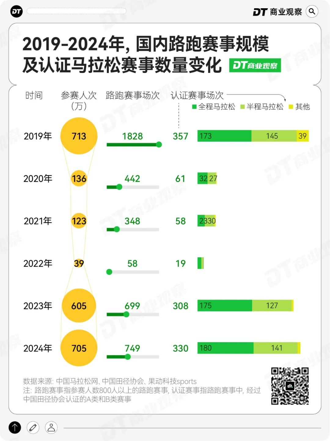 2024年路跑賽事共749場,累計參賽人數為705萬人,其中認證馬拉松賽事180場、認證半程馬拉松141場,2019年全馬和半馬的認證賽事場次則分別為173場、145場。