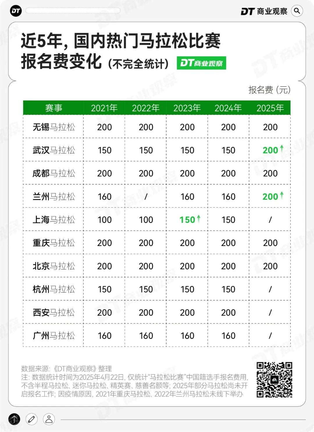 我們查看了目前國內報名人數較多的10場馬拉松比賽的歷年全馬報名費,發現馬拉松的報名費從以100-160元為主逐漸變成了以150-200元為主,2025年200元的報名費可能會成為“標配”。