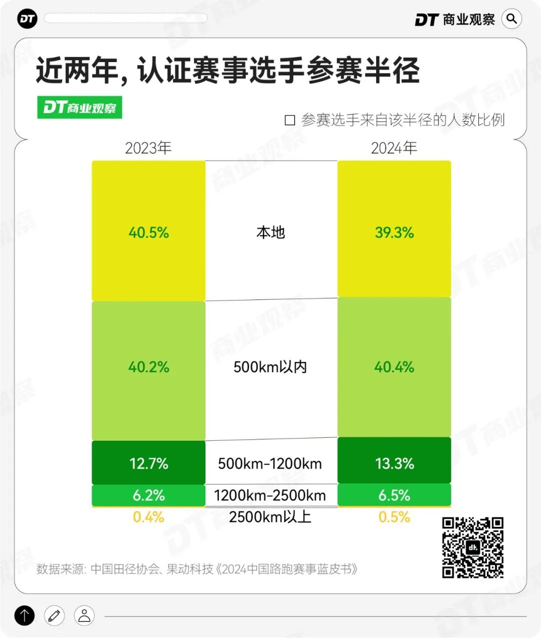 根據《2024中國路跑藍皮書》,2024年認證賽事選手參賽半徑,有60.68%都是非本地選手,且這個數據較2023年也有小幅提升(2023年為59.5%)——這意味着至少有一半以上跑友們需要為馬拉松付出交通和酒店成本。