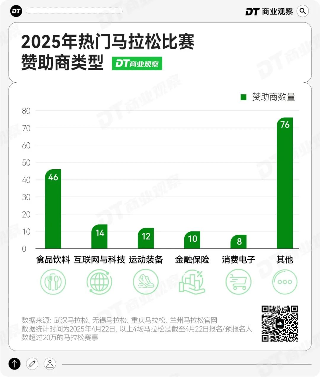 截至4月22日,今年國內以武漢馬拉松、無錫馬拉松、重慶馬拉松、蘭州馬拉松為代表的多場馬拉松比賽報名人數再創新高。我們統計了這4場報名人數超過20萬的比賽贊助情況發現,食飲品牌、互聯網與科技企業、運動裝備品牌最愛和馬拉松比賽合作。