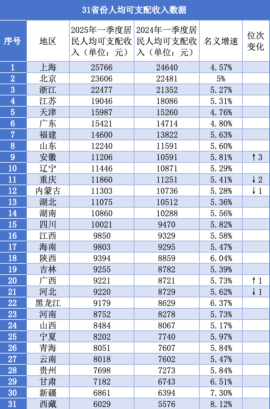 分省份來看,一季度居民人均可支配收入方面,上海繼續穩坐榜首,達25766元,北京和浙江位列第二、三位,分別為23606元和22477元。