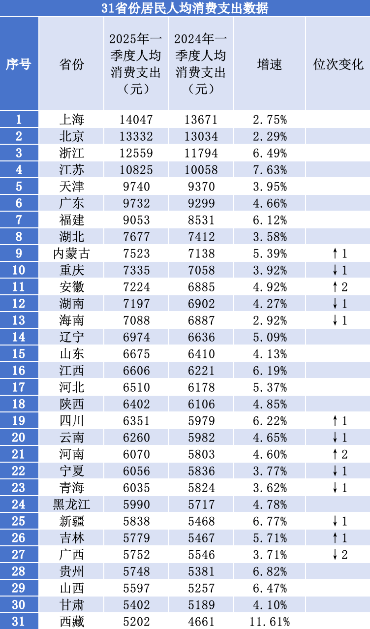 在一季度31省份人均消費支出排名中,上海、北京和浙江穩居前三,緊隨其後的江蘇、天津、廣東和福建分列4至7位。值得注意的是,這一名次序列與同期居民人均可支配收入的地區排名完全吻合,直觀印證了“收入水平越高,消費能力越強”的説法。