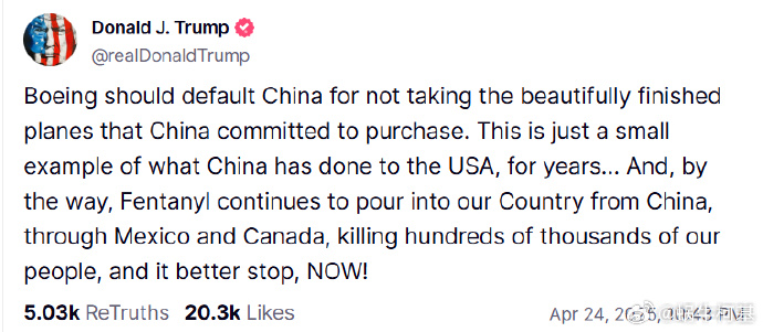 特朗普稱波音應該對中國不接收原本承諾購買的“精美飛機”做違約處理。