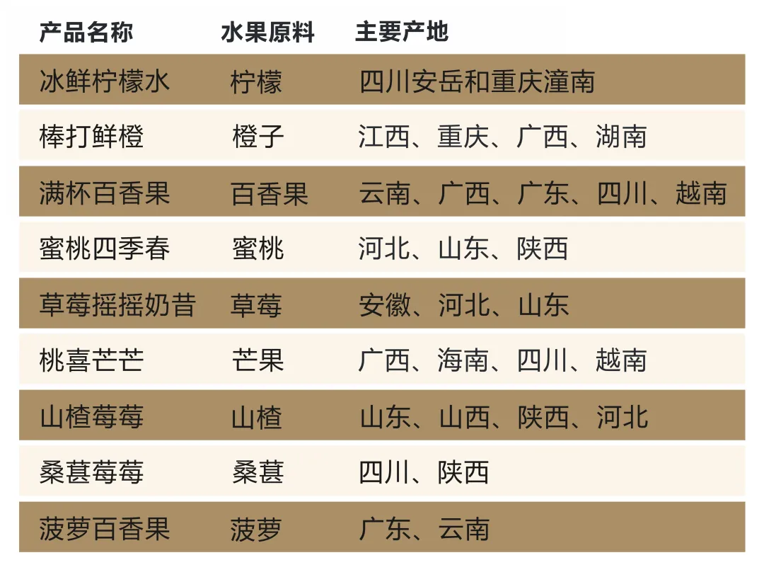 除了以上表格中用量較大的常規水果外,火龍果、牛油果、獼猴桃、藍莓等高價值感水果,也以區域限定或季節上新的形式出現在蜜雪的菜單上。
