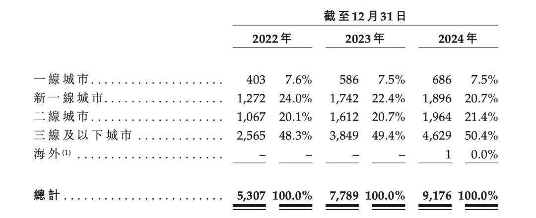 早期擴張的時候,滬上阿姨發現一線城市成本太高,果斷轉向三線及以下城市。2014年開放加盟,2020年門店突破2000家,2024年底達9,176家,其中99.7%為加盟店,全面覆蓋了國內300多個城市,其中有超過50%的門店都是位於下沉市場。尤其是,門店的單店初始投資成本低於古茗和蜜雪冰城。