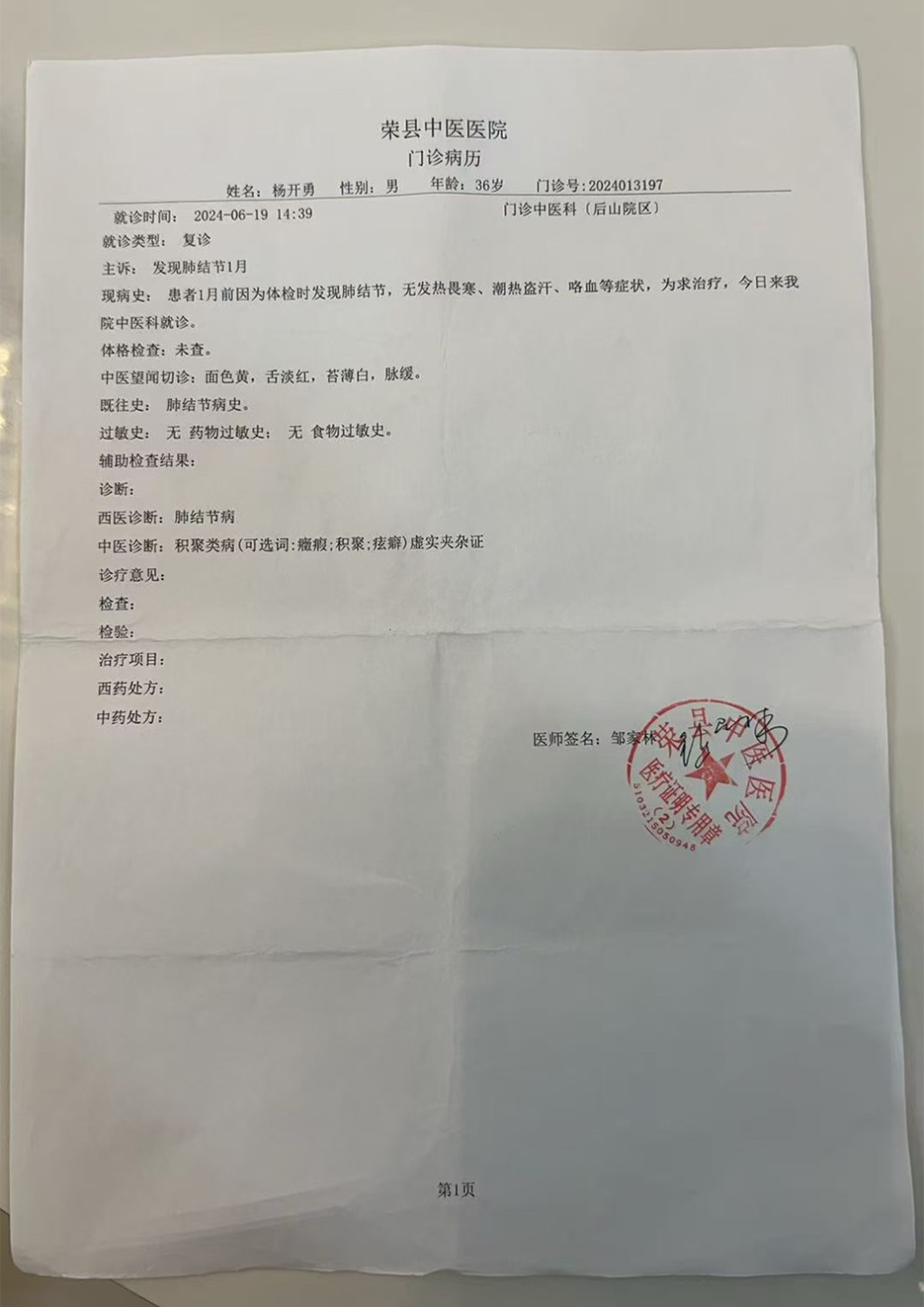 一次常規體檢,楊開勇的左肺上葉發現一個4mm的結節。之後,他經熟人介紹,前往四川省榮縣中醫院,找到醫生鄒家林為其治療,希望將肺結節消除。