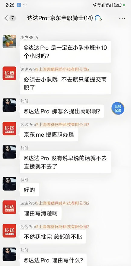 還有一張在社交媒體上廣泛流傳的聊天截圖顯示,有人在一個“達達Pro-京東全職騎士”的羣裏諮詢,是否一定要在小隊排班10個小時?隨後一位頭像為京東秒送的工作人員回覆稱,“必須要去小隊,不去只能提交離職”。