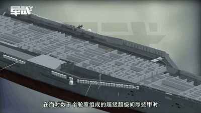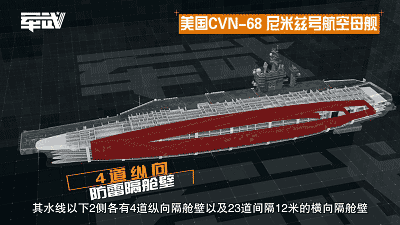不過要把所有部位加強到不被擊穿是不可能的,為了保護那些薄弱部位,尼米茲級採用多層裝甲間隙防護原理,其水線以下2側各有4道縱向隔艙壁以及23道間隔12米的橫向隔艙壁,組成8層共2000多個水密隔艙。由於反艦導彈的戰鬥部大都是破甲彈頭,在面對數千個艙室組成的超級超級間隙裝甲時,破甲彈的涓涓細流基本是無效通過。