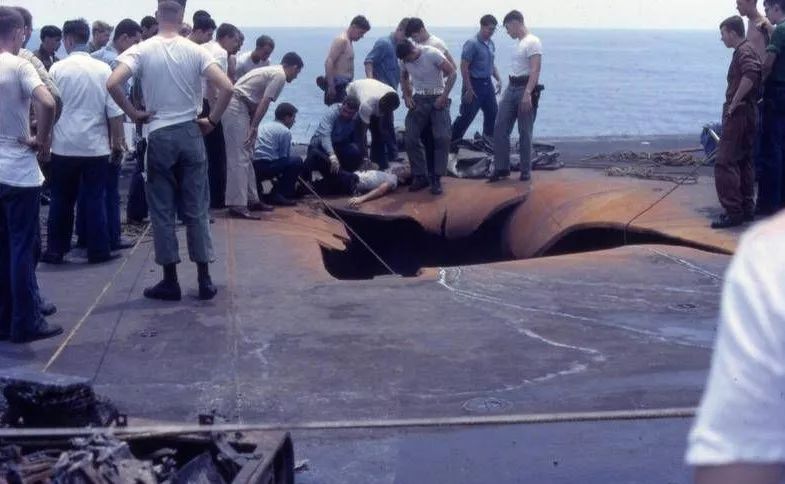 當然尼米茲級的防護也不是萬無一失的,相對於水線和水下近乎變態的防護能力,其水平裝甲就顯得異常可憐。為了防止水平裝甲過厚而造成重心不穩,尼米茲級的水平甲板只有50mm。如此薄弱的防護在受到攻擊時幾乎是裸奔的存在,1967年美軍福萊斯特號航母由於火箭彈誤引起甲班大爆炸,將50mm厚的甲板炸出數個大洞。這次事故讓福萊斯特號整整半年完全喪失了戰鬥力。