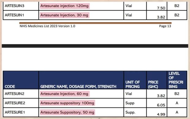 作為治療瘧疾重症主要藥物的青蒿琥酯(注射/栓劑)包含在加納國家健康保險藥物名單中
