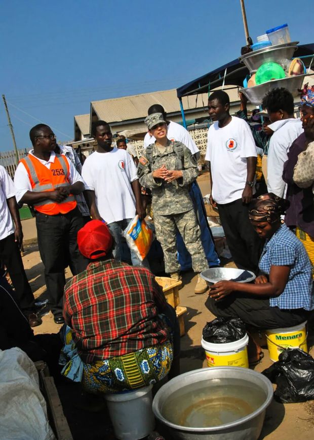 美國陸軍中士在加納向當地民眾講解瘧疾預防知識