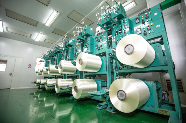 走進中簡科技車間,一束束白色原絲經氧化、高温碳化,最終收繞成一軸軸高性能黑色碳纖維。