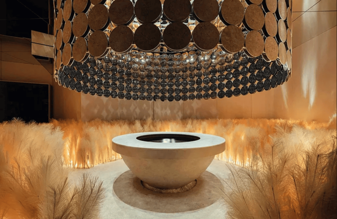 走進九牧在Casa Décor2025設計展上主題為“BRUMA: the Ritual of Senses”展廳,首先映入眼簾的是柔軟羽飾圍合的禪意空間:中央環形水池裝置與頂部450組懸浮九牧花灑構成的穹頂遙相呼應,光影在蒲草叢中流淌搖曳,定製香氛與韻律聲交織出沉浸式氛圍。