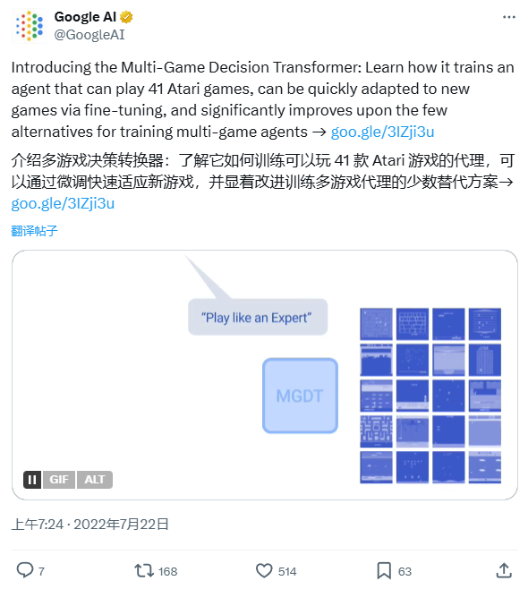即便是谷歌2022年推出的多遊戲智能體Transformer,能玩41款雅達利遊戲,但也依賴於大量預先學習的數據。