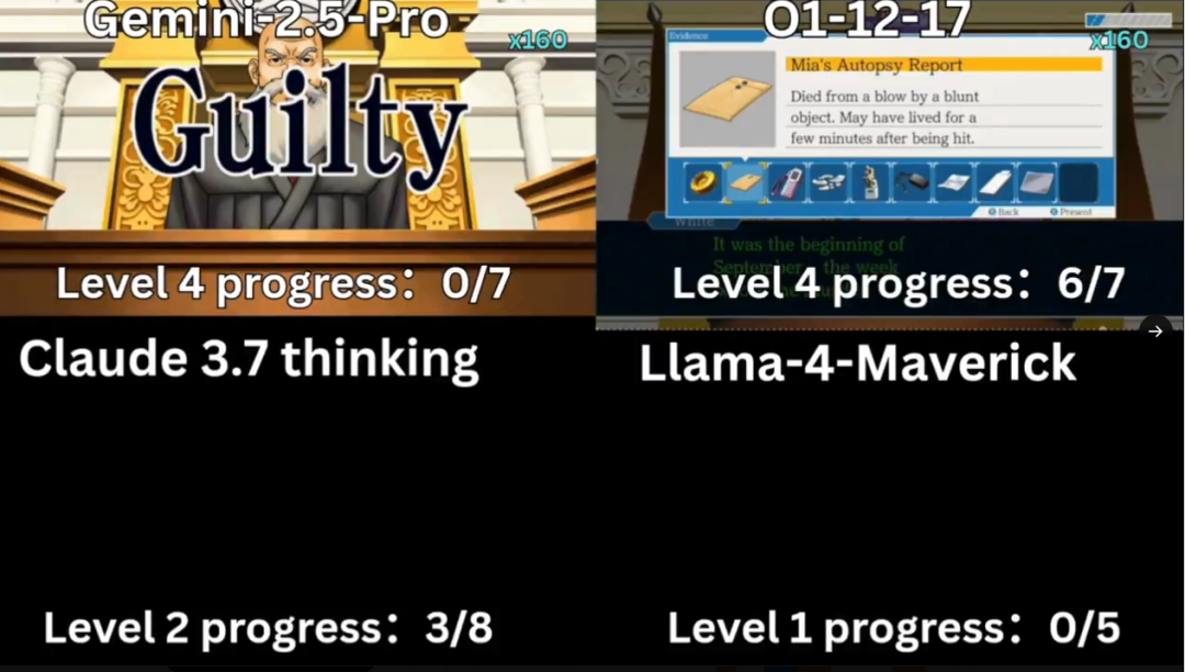 但最近,加州大學聖地亞哥分校的Hao AI實驗室進行了一項特別的AI推理能力測試,他們選取了四個不同的AI模型,在沒有任預先前訓練的情況下,直接讓它們玩《逆轉裁判》——四位“參賽選手”分別是Gemini 2.5 Pro、Claude 3.7 Sonnet、Llama-4 Maverick以及OpenAI o1。