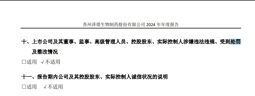 對於“上市公司及其董事、監事、高級管理人員、控股股東、實際控制人涉嫌違法違規、受到處罰及整改情況”信披一項中,該公司在年報中選擇了“不適用”(即表示沒有)。