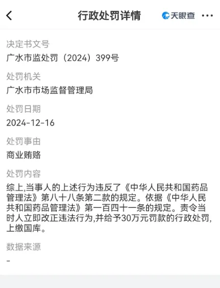 據天眼查信息顯示,就在2024年底,湖北省廣水市市場監管局以商業賄賂的事由對上市公司主體蘇州澤璟生物製藥股份有限公司處以30萬元的罰款處罰(處罰文書號廣水市監【2024】399號)。