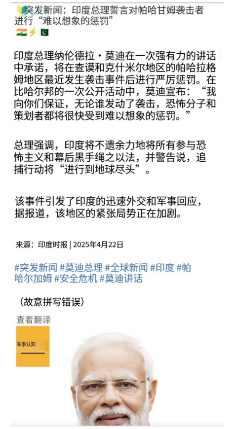 首先印度總理莫迪最近心理壓力肯定很大,也在做各種盤算,為什麼呢?因為剛剋死羅馬教皇方濟各的美國副總統萬斯來了印度。而羅馬教皇方濟各在會晤萬斯後一天就死亡的事實讓莫迪估計很慌。莫迪雖然在連任選舉中獲勝,但失去了大量議會席位。美國副總統萬斯訪問印度時美國提出讓印度開放農產品市場和數字主權,同時想讓印度把418億美元進口商品的關税砍一半,包括威士忌、摩托這些美國佔比較大的領域。與此同時美國希望印度更多的購買美國武器而非俄羅斯武器,美國還試圖説服印度在貿易戰中站在美國一邊對抗中國。而印度能換來的是美國減讓美國憑空製造的單向高額關税,還有就是美國承諾將蘋果等公司更多的產能從中國轉移到印度。目前印度電子製造、汽車零部件、製藥三大支柱產業對美依存度均超30%,特朗普的關税大棒直接導致汽車零部件出口驟降17%,藥品利潤被壓縮至2.8%,200萬產業工人站在失業懸崖邊。