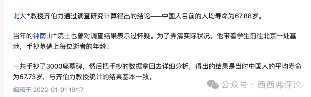 首先,鍾NS團隊手抄3000座墓碑,是一個謠言。原始的信息來源應該是這樣一個帖子,説北大教授齊伯力算出中國人均壽命67.88歲。鍾NS院士也對調查結果表示懷疑,到北京墓地去手抄了3000座墓碑,得出中國人人均壽命67.73歲。