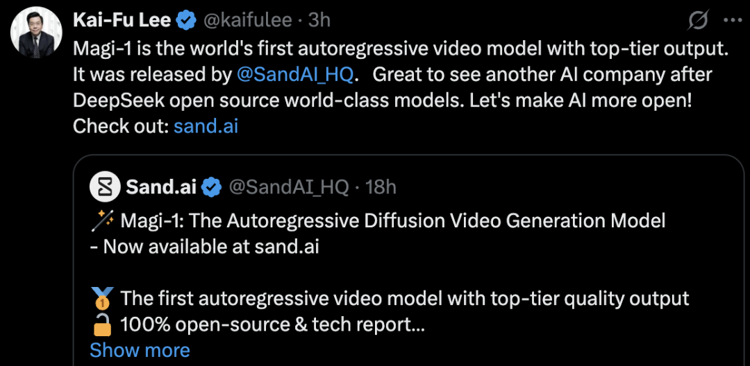 連業界大佬都發文力挺 sand.ai,李開復發帖,這是繼 DeepSeek 之後又一個開源的世界級模型。