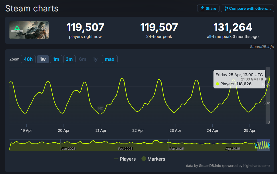在取得了如國服日活躍用户突破1200萬這樣的表現後,《三角洲行動》也沒忘了反哺海外。先是PC版上線,在最大的海外遊戲發行平台Steam,取得了全球熱銷前10、每日最高在線人數穩定10萬人的成績。