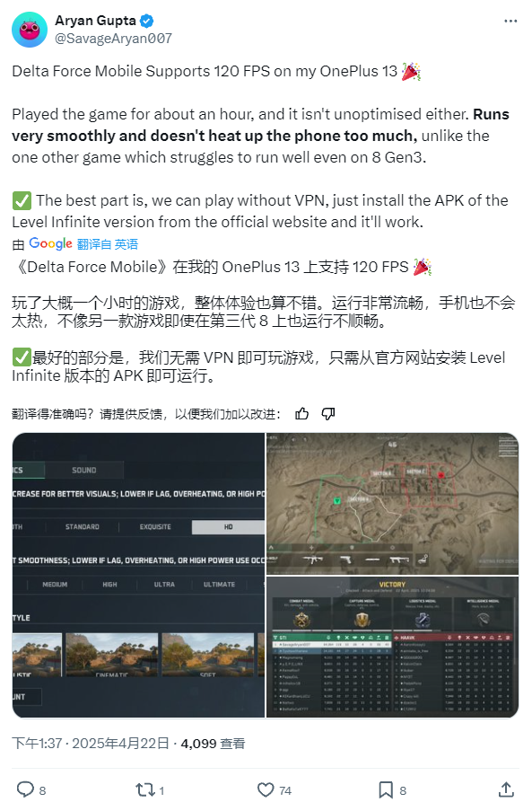 又因為《三角洲行動》花了不少時間對市面上的主流機型做針對性能優化——也是拜近年來國產手機順利出海所賜,海外玩家沾了不少光——《三角洲行動》在很多中端機型上都能以高畫質表現穩定運行60幀;在偏高端機型則是直飆120幀。